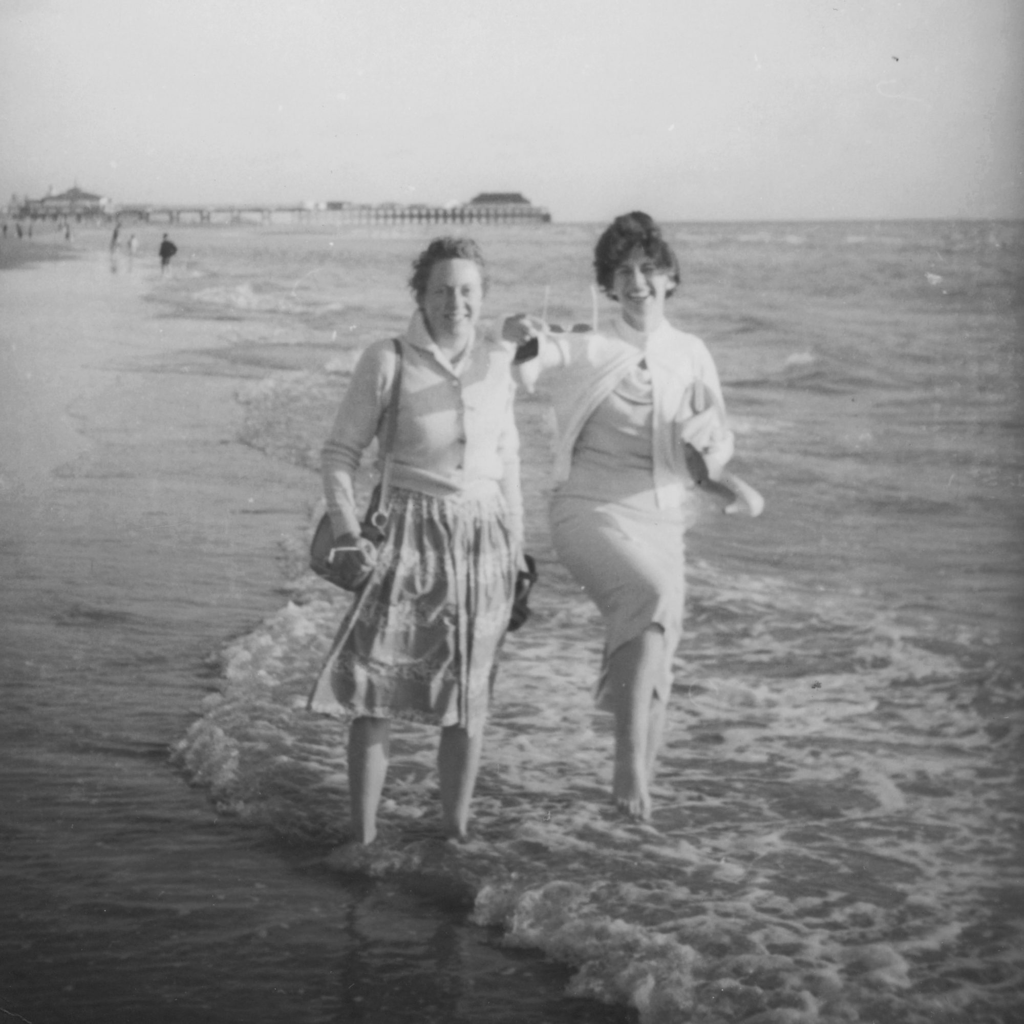 Festival times and seaside culture occupy a liminal space between respectability and transgression. This can be seen most clearly in many Victorian- and Edwardian-era photographs in The Family Museum collection. Despite the men being clad in three-piece suits, bleached-out Eton collars and ties, and the women in billows of fresh white cotton and elaborate ‘picture hats’, when naked from the knees down the façade of respectability dissolves. Taken in the 1920s, one image shows a woman trying to lift up her friend’s skirt, cajoling her to show a bit more leg. In another photograph from the 1960s, a young woman kicks up her leg while holding her sunglasses and shoes aloft with a theatrical joie de vivre; another woman stands in the sea with her shoes on.