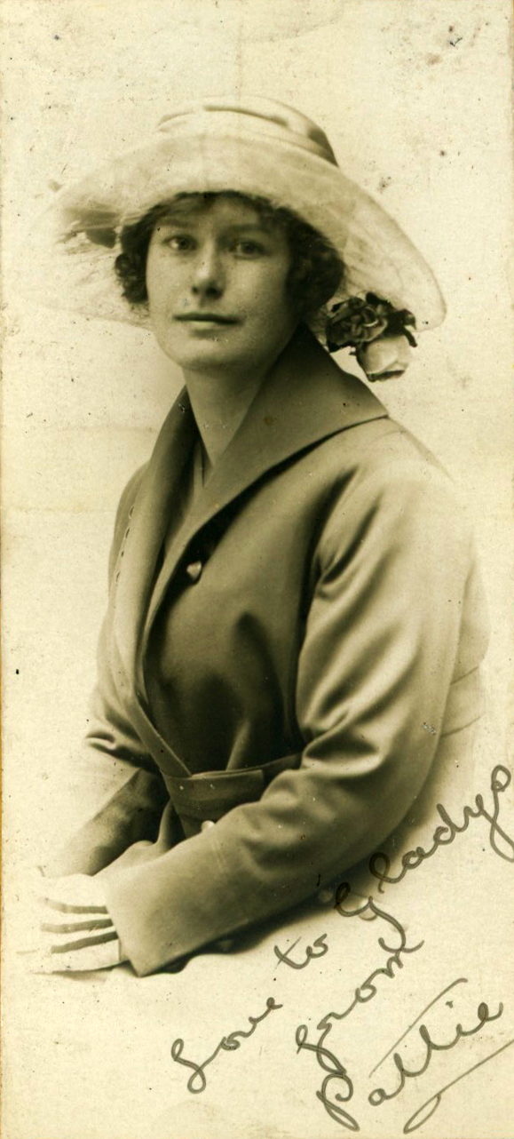 She appeared again and again, page after page. On the fourth page, her portrait sat next to a cabinet card photo of another young woman, who had written across her photo, ‘Love to Gladys from Pattie’. Gladys had curated the album. Its makeshift and creative nature, its often profligate, higgledy-piggledy arrangement and the relaxed poses of the young people in the photos, all attest to its creator’s youthfulness.