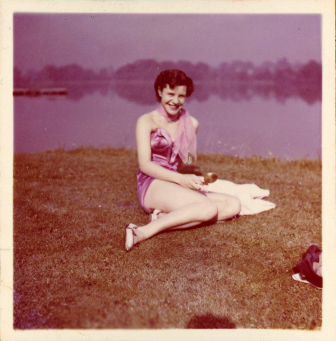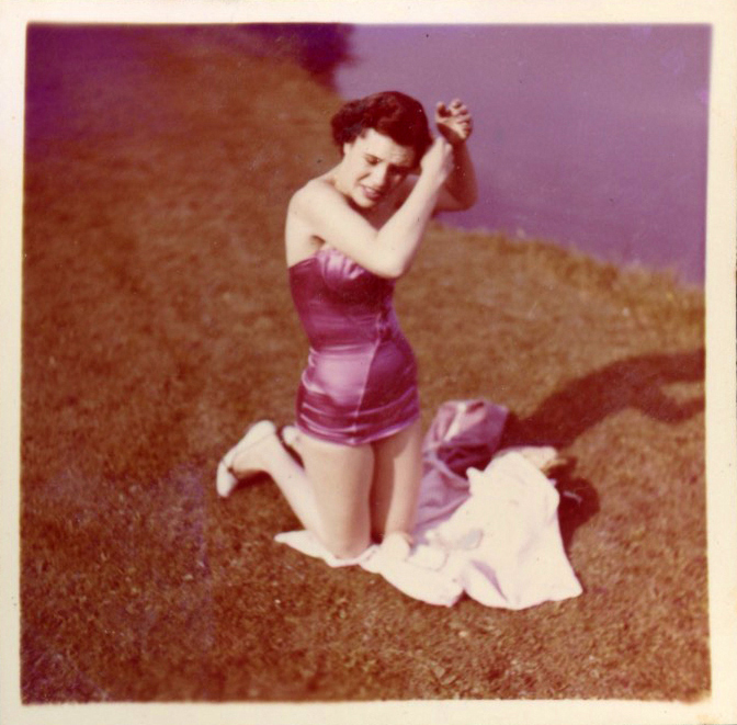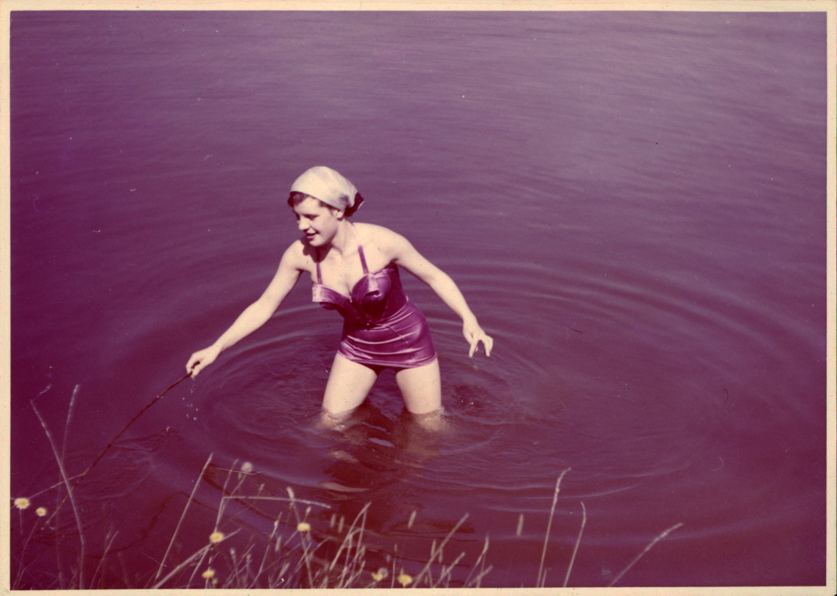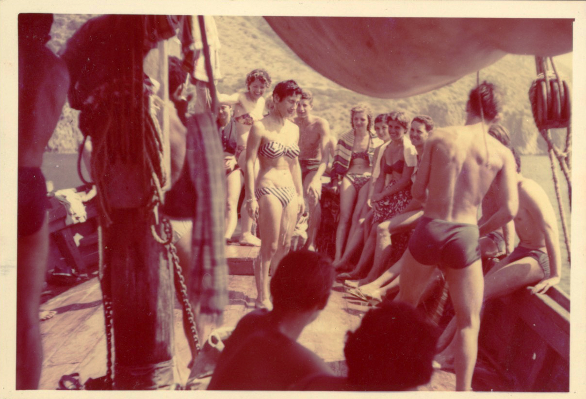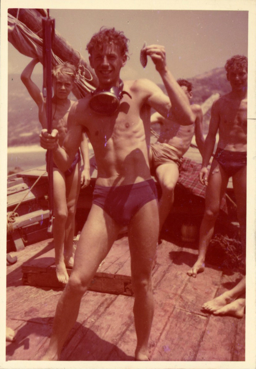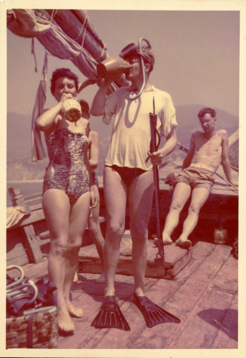 The Riviera shots, taken on board a yacht, show the merriment of a harpoon-fishing trip. One man can be seen ironically brandishing the fearsome weapon in one hand, with a minnow in the other. The lithe youth over his right shoulder has an expression that seems to announce a wisdom beyond his age. People from the 1950s in swimming costumes always look under nourished; the lack of gym bodies is striking. The photos of the little girl and young woman, both in their blue dresses with the stylish cars in the background, wouldn’t look out of place in Paris Match. One well-turned-out lady, with a little girl at her side, looks dressed for a wedding but steeled for a funeral.