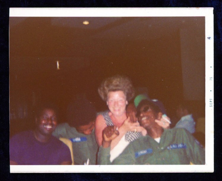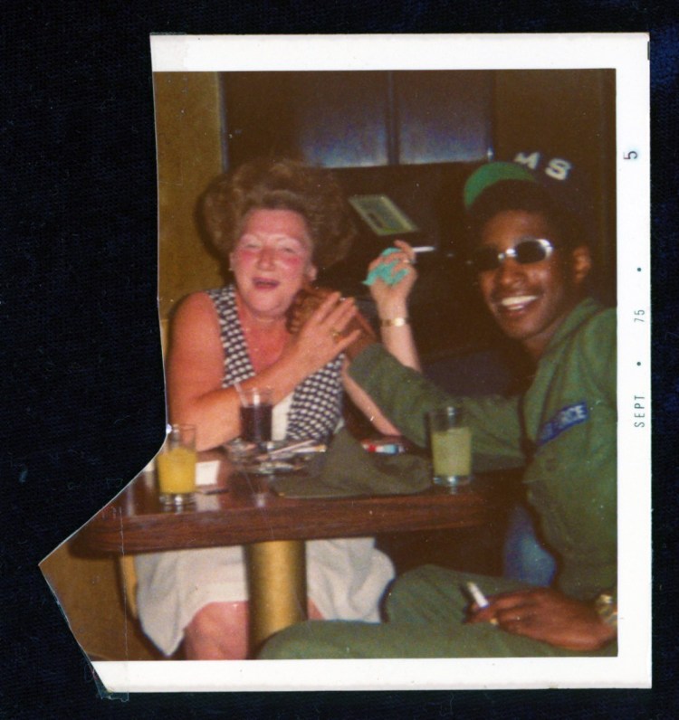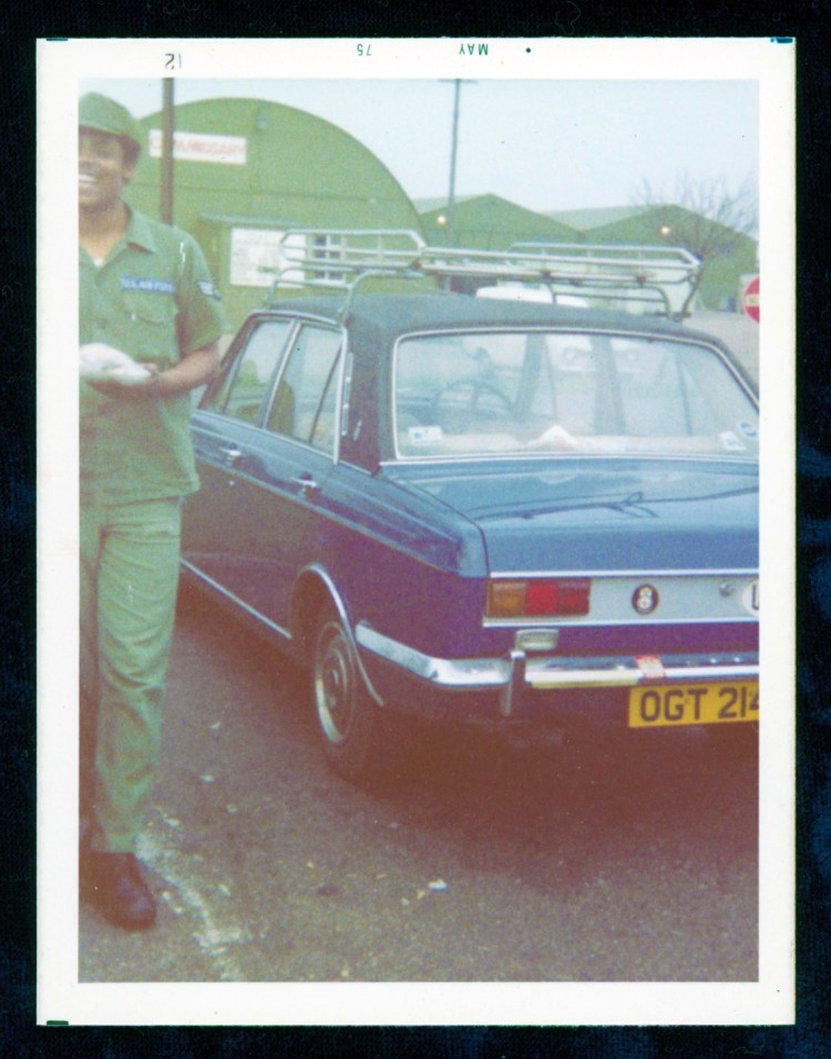 It features members of the US Air Force stationed in the UK. In the shot of the man standing next to the blue car, the barracks buildings of the camp can be seen in the background. One would have to assume that these soldiers were only in Britain for a short while, so it would seem unlikely that this album belonged to one of them. More likely, it was owned by the ebullient bonne vivante with whom they are seen partying here.