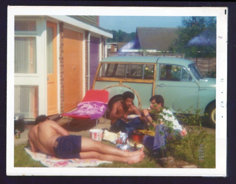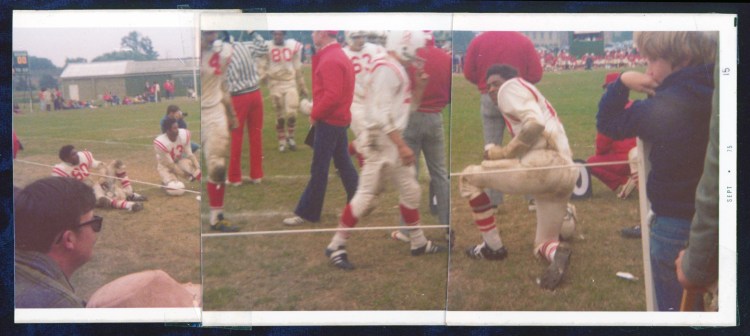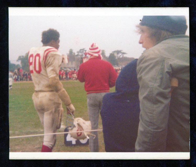 In the image of them picnicking in the front garden, it is nice to see they found some home comforts in the form of a Colonel Sander’s Kentucky Fried Chicken bucket meal, a fast-food outlet that first opened in the UK in Preston in 1968. The Morris Minor ‘Woody’ wagon in the background also has echoes of American surf culture. Four photos show an American football game. The focus of the photographer’s attention in these shots seems to be the player wearing shirt number 80.