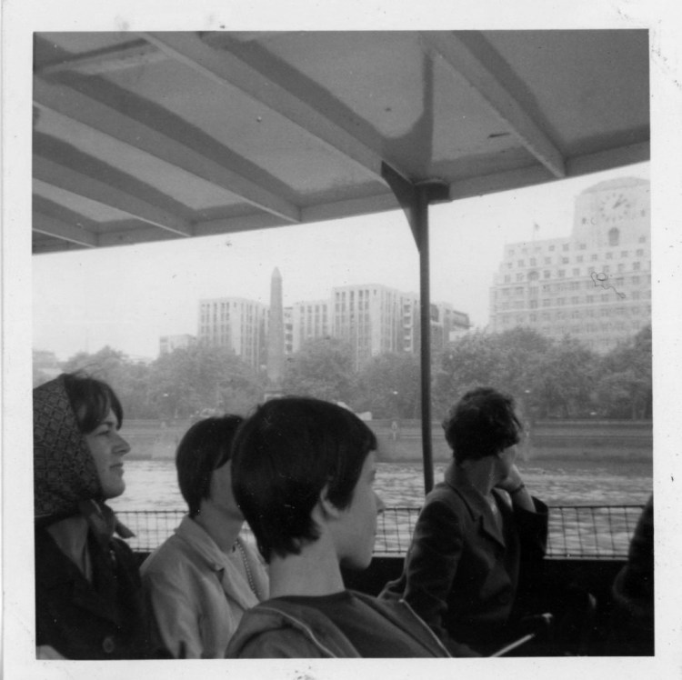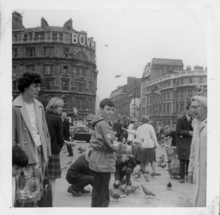 There are six photos spread across three pages, which appear under the heading: ‘Last day with the Foxe’s (before they moved), 1966’. David Fox was the photographer’s friend. The earliest photos of him in the album are dated 1963. They chose to spend their last day together in central London, among other things, feeding the pigeons in Trafalgar Square, once a must-do ritual during any day trip to the capital. They may not have had to travel far, as in one photo the photographer is shown wearing his ‘42nd Greenwich Scouts Uniform’. They took a boat trip down the Thames, viewed Cleopatra’s Needle and visited Westminster Abbey, where the Foxes and their mother were photographed in the Cloisters. In this shot, the way David looks up at his mother seems to implore.