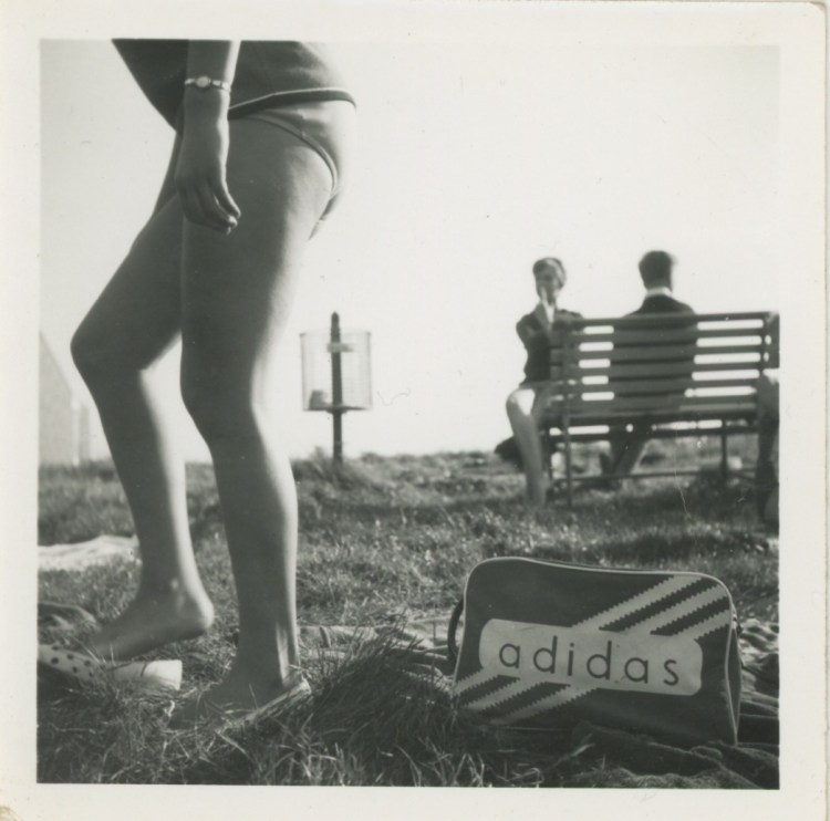 The vertical centre of the frame runs between the bin and the woman sitting reversed on the bench – this empty space seems an unlikely subject for a photo. As she puts on her shoes, the woman in the foreground brings narrative to the moment. Seen in candid motion, she is clearly not posing for the shot. The man on the bench with his back to the camera adds a little mystery to the scene. The Adidas bag anchors the composition and dates the image, but its position in the frame is not central enough to assume it as the subject of the photo. I believe the photographer was inspired to take a picture of the woman on the bench. Out of focus and also caught in motion, she is the only person in the shot facing the camera. If she were the subject, then in this regard the photo is an abject failure, but the overall effect is an artistic success.